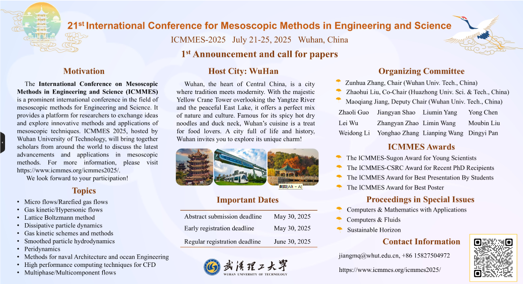 The 21st International Conference on Mesoscopic Methods in Engineering and Science (ICMMES 2025) will be held in Wuhan, Hubei Province from July 21 to 25, 2025. Hosted by Wuhan University of Technology, the conference is organized by the School of Naval Architecture, Ocean and Energy Power Engineering, and co-organized by Huazhong University of Science and Technology and Ningbo East University of Technology.