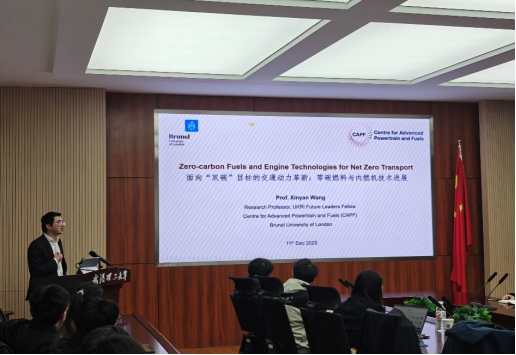 王新颜教授在报告中对比不同动力路线的全生命周期碳排放,指出“发动机+低/零碳燃料”具备快速落地与减碳双重优势。针对氢、氨、甲醇等燃料的关键燃烧特性差异,他强调需通过稀薄燃烧、缸内直喷等技术实现高效低排放,并介绍布鲁内尔大学在零碳内燃机燃烧控制、热效率优化等领域的研究进展。