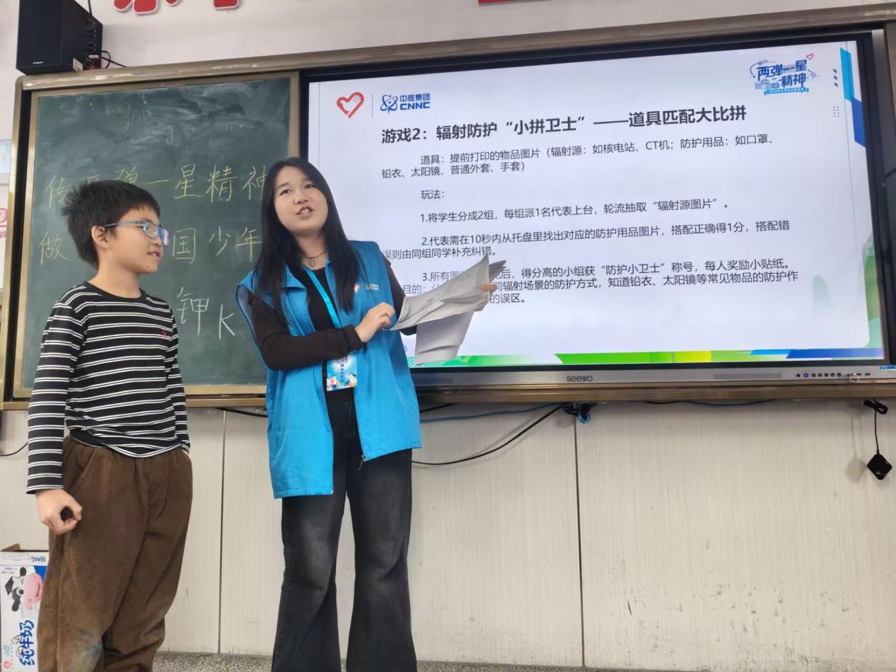 另一项“辐射防护‘小卫士’——道具匹配大比拼”同样精彩纷呈。同学们被分成两组,轮流抽取核电站、CT机等辐射源图片,并从托盘里找出对应的防护用品图片。同学们在紧张激烈的比拼中,不仅掌握了不同辐射场景的防护方法,更培养了团队协作意识。