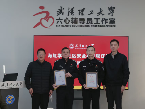 余区管委会党委书记李洪彦、学工部副部长沙成彧为杨园派出所章铭警官、高峰警官颁发安全导师聘任证书。