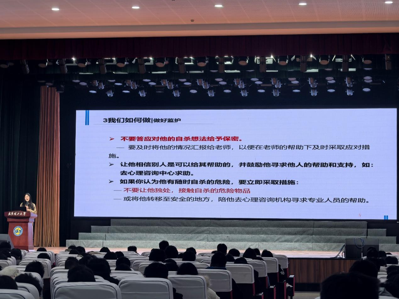 在具体策略部分,罗金晶老师围绕“能做什么”与“如何去做”展开说明,强调面对日常压力应主动调适,而在出现危机征兆时要及时识别、及早预防并寻求专业帮助。清晰的讲解结构与贴近研究生生活的案例,有效提升了同学们的心理危机识别能力和心理健康防护意识。接着,罗老师简要介绍了学校心理健康教育中心,阐释了心理咨询的基本内容,包括“是什么、怎么做、谁需要、是否有效、是否安全”等核心问题,帮助学生正确认识心理咨询、消除求助顾虑。