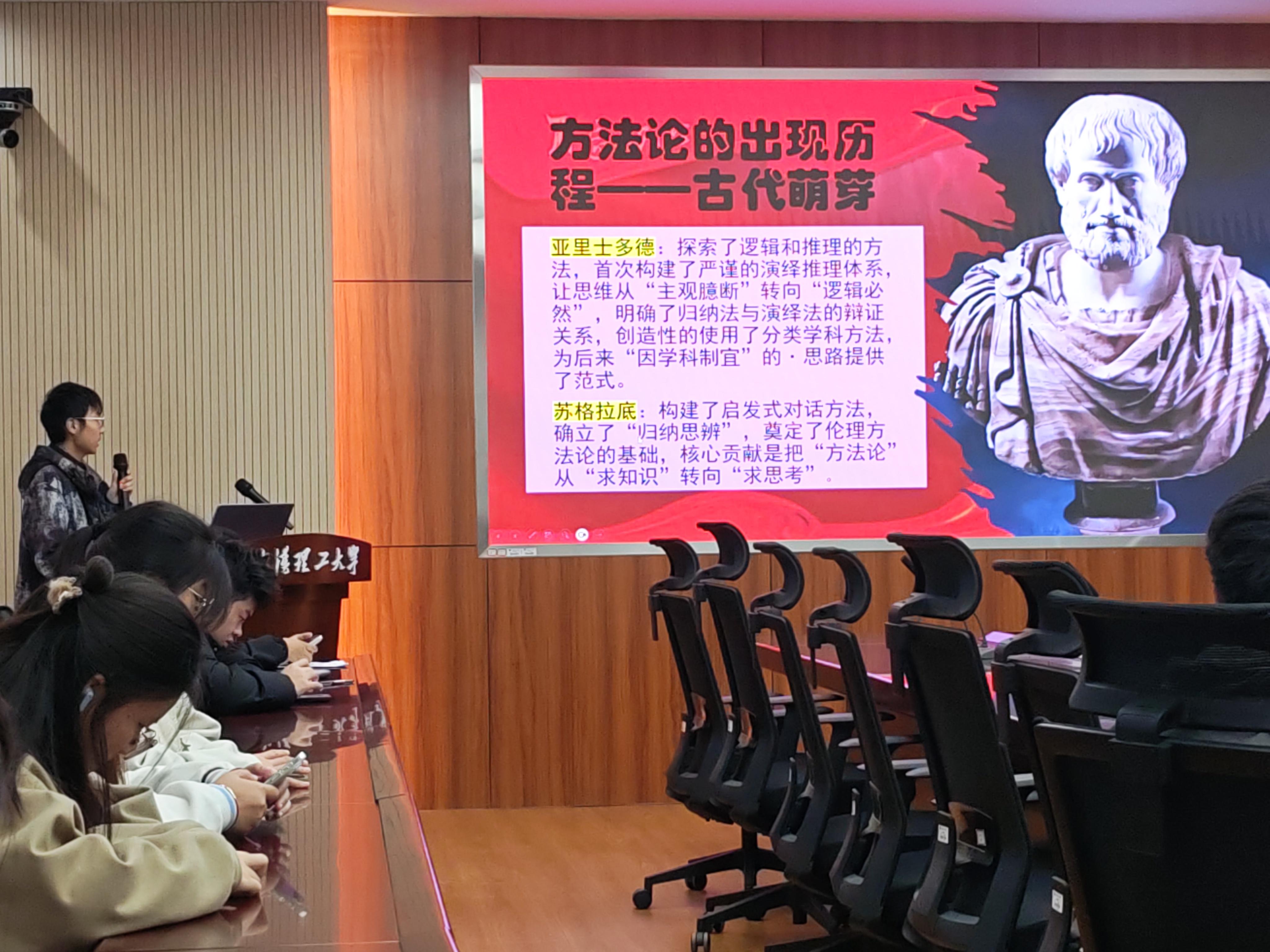孙宇豪同学聚焦辩证唯物主义方法论,系统梳理了其从古代萌芽、近代发展到现代形成的演进脉络。他结合“六个必须坚持”等党的创新理论成果,分享了辩证唯物主义方法论的当代发展与实践指向,并通过科研攻关与人生规划中的具体案例,生动说明了这一理论作为“思想武器”和“方法论钥匙”的现实价值。